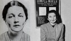 Women without dimples are said to envy the women that have them because dimples are "pitfalls for the men" that "[are] something purely natural and unattainable by art".[35] While it is not possible to give a definite explanation as to why dimples are attractive on a woman, researchers believe this "neutral feature" can be linked to paternity confidence, which is the ability of a man to easily distinguish his own offspring.[37] This has led to artificial attempts to create them: the Ohio-based Dolly Dimpler company advertized in Photoplay about a device that created dimples in customers' cheeks;[38] in 1936, Isabella Gilbert invented the Dimple Maker, a face-fitting brace which pushed dents into the cheeks to emulate dimples,[39] but it is unknown whether the artificial dimples could last this way (the American Medical Association argued that frequent users could develop cancer);[40] and in the 21st century, people undergo dimple surgery.[41]