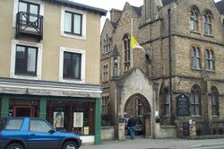 Flag of Vatican City flying at half-staff outside the Oxford Oratory on the day after the death of Pope John Paul II
