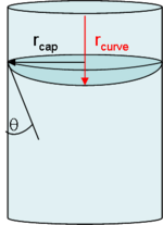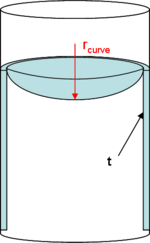 It is also worthy to mention that different pore geometries result in different types of curvature. In scientific studies of capillary condensation, the hemispherical meniscus situation (that resulting from a perfectly cylindrical pore) is most often investigated due to its simplicity.[5] Cylindrical menisci are also useful systems because they typically result from scratches, cuts, and slit-type capillaries in surfaces. Many other types of curvature are possible and equations for the curvature of menisci are readily available at numerous sources.[5][10] Those for the hemispherical and cylindrical menisci are shown below.