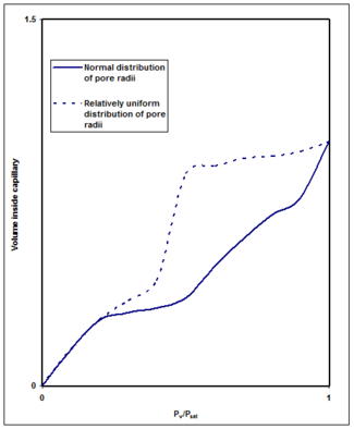 Pores that are not of the same size will fill at different values of pressure, with the smaller ones filling first.[2] This difference in filling rate can be a beneficial application of capillary condensation. Many materials have different pore sizes with ceramics being one of the most commonly encountered. In materials with different pore sizes, curves can be constructed similar to Figure 7. A detailed analysis of the shape of these isotherms is done using the Kelvin equation. This enables the pore size distribution to be determined.[2] While this is a relatively simple method of analyzing the isotherms, a more in depth analysis of the isotherms is done using the BET method. Another method of determining the pore size distribution is by using a procedure known as Mercury Injection Porosimetry. This uses the volume of mercury taken up by the solid as the pressure increases to create the same isotherms mentioned above. An application where pore size is beneficial is in regards to oil recovery.[13] When recovering oil from tiny pores, it is useful to inject gas and water into the pore. The gas will then occupy the space where the oil once was, mobilizing the oil, and then the water will displace some of the oil forcing it to leave the pore.[13]