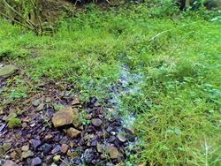 Natural spring in Pennsylvania where runoff flows from above down through grass and rocks.