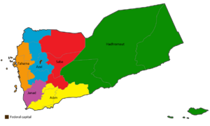 The federalization of Yemen or the Federal Republic of Yemen was the final outcome of the National Dialogue Conference, the Dialogue members also agreed that Yemen would be transformed into a 6-region federal system.[1] The regions would be Azal, Saba, Janad and Tihama in the north, Aden and Hadramawt in the south. Sana’a will have a special status and not be part of any region.[2] Aden, the former southern capital, would also have a special status but will be part of Aden region. Azal, Saba, Janad and Tihama would be northern provinces where Aden and Hadramawt would be southern.[3] The proposal also includes changing the title of "Governorate" to "state".