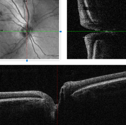 The optic disc is placed 3 to 4 mm to the nasal side of the fovea. It is a vertical oval, with average dimensions of 1.76mm horizontally by 1.92mm vertically.[2] There is a central depression, of variable size, called the optic cup. This depression can be a variety of shapes from a shallow indentation to a bean pot—this shape can be significant for diagnosis of some retinal diseases.