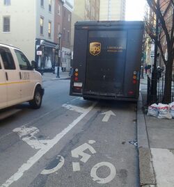 Safe streets activists have attacked UPS, along with other parcel delivery services, for frequently illegally parking their vehicles in bike lanes while making deliveries, a practice that endangers cyclists.[117][118][119] They were sued over it in New York in 2015,[120][121][122] and criticized alongside peers in a letter from Washington, D.C.'s transportation agency in 2018.[123]