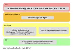 Enforcing the Epidemics Act falls under the jurisdiction of the cantons, unless the Confederation assumes responsibility.[16] This is in accordance with the Federal Constitution, which states in Art. 118(2) that the Confederation is operationally active only in specific health protection areas. Nevertheless, the Confederation has exclusive responsibility for legislation on communicable diseases and ensures that federal law is enforced by the cantons.[17]