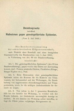 The Federal Act on the Control of Communicable Human Diseases of September 28, 2012, currently in force, is a complete revision of the Federal Act of December 18, 1970. In turn, this was based on the Federal Act on Measures Against Publicly Dangerous Epidemics (Bundesgesetz betreffend Massnahmen gegen gemeingefährliche Epidemien) of July 2, 1886. The Epidemics Act of 1886 solely addressed public health epidemics, namely smallpox, cholera, typhus and the plague. Any other diseases were a cantonal matter. The typhus epidemic of 1963 in Zermatt, with about 400 cases and several deaths, led to a complete revision of the Epidemics Act of 1886. Previous outbreaks of diseases such as tuberculosis had also led to changes in the Federal Constitution (FC). Between the complete revision of December 18, 1970, and the update of September 28, 2012, there were various minor revisions, most recently in 2006. Almost all of these revisions have significantly increased the scope of the Confederation's powers.[1]