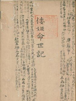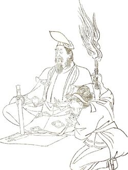 These teachings were expounded by the "Three Nerves" of the Tengen Shinhen Shinmyou Sutra, the Local Shinto Shinmyou Sutra, and the Jingen Shinryoku Shinmyou Sutra.[93] These sutras were said to be the teachings of Tenji-Yane, but these three sutras are fictitious and there is no evidence that they were ever produced.[94] Kanetu forged sutras similar to these by posing as the authors, such as Kamatari Nakatomi, to create his own sutras.[95] The history of the sanctuary was also created by Kaneku himself.[96]