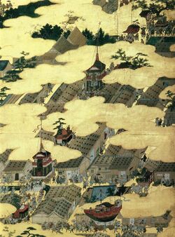 In the former case, the lord would assign the townspeople to do town work, such as building roads and breeding horses, and would have them participate in the festival by pulling things.[120] In the latter case, a headman was selected from each town, and the headman shared the expenses, or the expenses were shared from the expenses of the town that provided the headman.[120] Although the lords issued thrift ordinances and other regulations for festivals, they generally allowed freedom.[120]