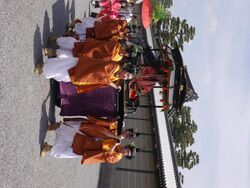 Among the rituals of the Ritsuryo State, the Prayer Year Festival, the Monthly Festival, and the Dai-namesai Festival used the unique Japanese ritual form of banpei, which could not be seen in other countries.[18] The Nakatomi clan would deliver a prayer of congratulation, and the Saibe clan would distribute woven offerings to the priests, who would then offer them to the gods of their respective shrines.[19] First, the Nakatomi clan presented the emperor with purifying linen, and the Tohan and Saibun clans presented the emperor with purifying swords and said the words of exorcism. Next, the men and women of the 100 government officials gathered in the exorcism room at Suzaku-mon Gate, where the Nakatomi clan read the words of exorcism, and the Turabu clan performed the exorcism.[20]
