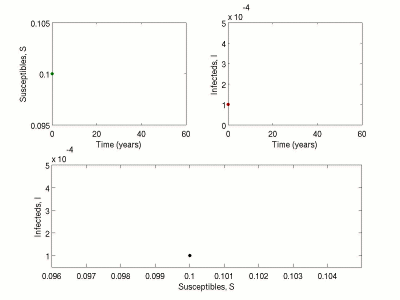 Consider the following modification to the standard differential equation for the level of infection within the population: \[ \frac{dI}{dt} \; = \; \beta S I \, - \, \gamma I \, + \, f(S,I)\xi \] where \(\xi(t)\) is a source of Gaussian noise (see Stochastic Dynamical Systems for more information about this type of system). The function \(f\) determines how the noise scales with the population dynamics, several common forms are: