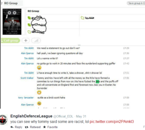 Leaked Skype conversations by Tommy Robinson's former PA show that the EDL has actively sought to permanently ban Jews and gay people from joining the organisation, as well as an unsurprising torrent of abuse and homophobic remarks.[23]