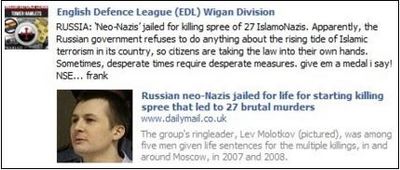 In practice, it is a motley rabble of neo-Nazis, other bigots, and football hooligans. Many EDL members have been charged with intimidation and assaults against immigrants, and arson attacks against Mosques. This is hardly defending British people, particularly British Muslims. Unlike the more violent group Stormfront, however, no EDL member has yet been found guilty of a racist murder.