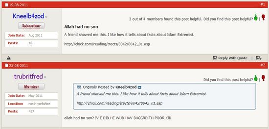 At the official EDL forum, general consensus appears to be that Islam in general is the problem and not the Muslims, as the EDL leader had made apparent frequently. For example, in a 2013 interview with the BBC, he stated, "While I want to lead the revolution against Islamist ideology, I don't want to lead the revolution against Muslims," an idea that was lost as he stated he had lost control of the EDL to right-wing loons (which resulted in his departure from said organisation).[9][10][11] This has led to such charming sights as someone cheering on the deaths of Muslims in the Pakistani floods in 2010.[12]