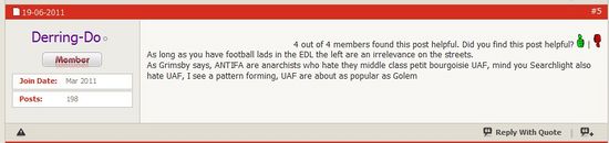 However, on an old EDL forum, a gay EDL supporter wrote about how he was turned upon and viciously beaten by his supposed comrades, leaving him with "blood pouring out of two bad cuts" and a smashed-up car.[26]