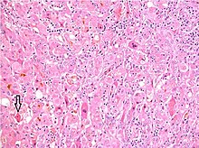 The pathway by which hepatic viruses cause viral hepatitis is best understood in the case of hepatitis B and C.[15] The viruses do not directly cause apoptosis (cell death).[15][53] Rather, infection of liver cells activates the innate and adaptive arms of the immune system leading to an inflammatory response which causes cellular damage and death.[15][53] Depending on the strength of the immune response, the types of immune cells involved and the ability of the virus to evade the body's defense, infection can either lead to clearance (acute disease) or persistence (chronic disease) of the virus.[15] The chronic presence of the virus within liver cells results in multiple waves of inflammation, injury and wound healing that over time lead to scarring or fibrosis and culminate in hepatocellular carcinoma.[53][54] Individuals with an impaired immune response are at greater risk of developing chronic infection.[15] Natural killer cells are the primary drivers of the initial innate response and create a cytokine environment that results in the recruitment of CD4 T-helper and CD8 cytotoxic T-cells.[55][56] Type I interferons are the cytokines that drive the antiviral response.[56] In chronic Hepatitis B and C, natural killer cell function is impaired.[55]
