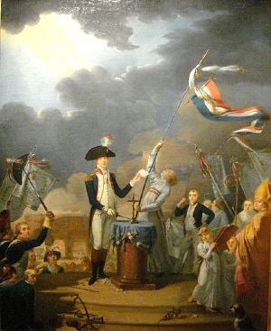 The oath of La Fayette at the Fête de la Fédération, 14 July 1790. Talleyrand, then Bishop of Autun, can be seen at the extreme right. French School, 18th century. Musée Carnavalet.