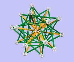 One may extend the zome system by adjoining green vectors. The "standard green vectors" comprise the [math]\displaystyle{ A_5 }[/math]-orbit of the vector [math]\displaystyle{ (2,2,0) }[/math] and a "green strut" as any vector which can be obtained by scaling a standard green vector by any integral power [math]\displaystyle{ \varphi^n }[/math]. As above, one may check that there are [math]\displaystyle{ |A_5| }[/math]=60 standard green vectors. One may then enhance the zome system by including these green struts. Doing this does not affect the set of nodes.