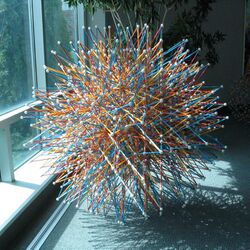 The Zometool plastic construction set toy is produced by a privately owned company of the same name, based outside of Longmont, Colorado, and which evolved out of Baer's company ZomeWorks. Its elements consist of small connector nodes and struts of various colors. The overall shape of a connector node is that of a non-uniform small rhombicosidodecahedron with each face replaced by a small hole. The ends of the struts are designed to fit in the holes of the connector nodes, allowing for syntheses of a variety of structures. The idea of shape-coding the three types of struts was developed by Marc Pelletier and Paul Hildebrandt. To create the "balls," or nodes, Pelletier and Hildebrandt invented a system of 62 hydraulic pins that came together to form a mold.[4] The first connector node emerged from their mold perfectly on April 1, 1992.