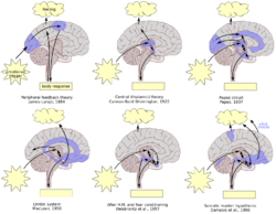 From a mechanistic perspective, emotions can be defined as "a positive or negative experience that is associated with a particular pattern of physiological activity."[4] Emotions are complex, involving multiple different components, such as subjective experience, cognitive processes, expressive behavior, psychophysiological changes, and instrumental behavior.[9][10] At one time, academics attempted to identify the emotion with one of the components: William James with a subjective experience, behaviorists with instrumental behavior, psychophysiologists with physiological changes, and so on. More recently, emotion has been said to consist of all the components. The different components of emotion are categorized somewhat differently depending on the academic discipline. In psychology and philosophy, emotion typically includes a subjective, conscious experience characterized primarily by psychophysiological expressions, biological reactions, and mental states. A similar multi-componential description of emotion is found in sociology. For example, Peggy Thoits described emotions as involving physiological components, cultural or emotional labels (anger, surprise, etc.), expressive body actions, and the appraisal of situations and contexts.[11] Cognitive processes, like reasoning and decision-making, are often regarded as separate from emotional processes, making a division between "thinking" and "feeling". However, not all theories of emotion regard this separation as valid.[12]