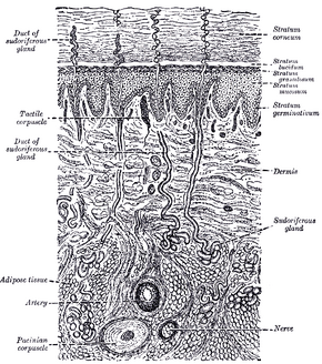 ![]() A diagrammatic sectional view of the skin (click on image to magnify). (Dermis labeled at center right.) | |
