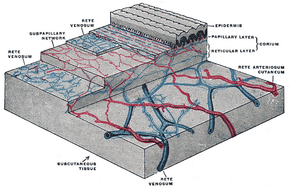 ![]() The distribution of the blood vessels in the skin of the sole of the foot. (Corium – TA alternate term for dermis – is labeled at upper right.) | |