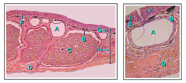 Structurally, the ducts of the granular gland initially maintain a cylindrical shape. When the ducts mature and fill with fluid, the base of the ducts become swollen due to the pressure from the inside. This causes the epidermal layer to form a pit like opening on the surface of the duct in which the inner fluid will be secreted in an upwards fashion.[25]