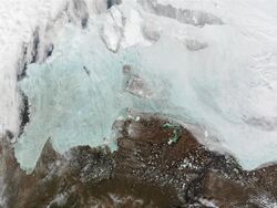 The total catchment area is 1,342,000 km2.[9] Among the rivers flowing into the East Siberian Sea, the Indigirka, Alazeya, Chukochya, Kolyma, Rauchua, Chaun, and Pegtymel are the most important. Only a few rivers are navigable.[10] The coastline of the sea is 3,016 km long.[7] It makes large bends, sometimes stretching deep into the land, and has a rather different topography in the eastern and western parts. Fine bends are rare and occur only in the river deltas. The coastal section between the New Siberian Islands and the mouth of the Kolyma River is uniform, with low and slowly varying slopes. It extends landwards to the marshy tundra filled with numerous small lakes. In contrast, the coast to the east of the Kolyma River is mountainous, with steep cliffs.[8][11]