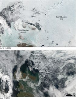 The sea freezes over between October–November and June–July. The ice is continuous and stationary near the coast, reaching the thickness of 2 m by the end of winter; The thickness decreases from west to east. Further into the sea, the ice cover transforms into drifting ice having the thickness of 2–3 m. The southern winter winds shift this ice northwards, making polynyas near the sea centre.[11] There are no icebergs in the sea. Ice melting typically starts around May, first around the delta of the major Kolyma River.[10]