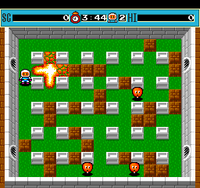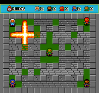 The single player game is divided into eight worlds, each one divided into eight stages.[1][2] Each stage is presented as a maze of blocks filled with enemies. By using bombs, the player must destroy the blocks blocking their path and defeat all of the enemies. Once all of the enemies are defeated and the hidden exit is uncovered, the player can proceed to the next stage. Each stage also includes one power-up hidden under one of the blocks, which can increase the number of bombs drops, increase the range of the bombs' explosions, and other useful powers. The eighth stage in each world is a boss battle.