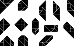 Over 6500 different tangram problems have been created from 19th century texts alone, and the current number is ever-growing.[26] Fu Traing Wang and Chuan-Chih Hsiung proved in 1942 that there are only thirteen convex tangram configurations (config segment drawn between any two points on the configuration's edge always pass through the configuration's interior, i.e., configurations with no recesses in the outline).[27][28]