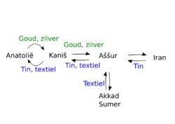 In the second millennium BC, money was not yet invented, and Assyrian merchants used gold for wholesale trade and silver for retail trade. Gold was considered eight times more valuable than silver. But there was one more metal, amutum, which was even more valuable than gold. Amutum is thought to be the newly discovered iron and was forty times more valuable than silver. The most important Anatolian export was copper, and the Assyrian merchants sold tin and clothing to Anatolia.[7]