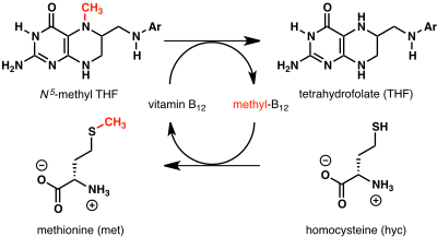 Methionine synthase, coded by MTR gene, is a methyltransferase enzyme which uses the MeB12 and reaction type 2 to transfer a methyl group from 5-methyltetrahydrofolate to homocysteine, thereby generating tetrahydrofolate (THF) and methionine.[104] This functionality is lost in vitamin B12 deficiency, resulting in an increased homocysteine level and the trapping of folate as 5-methyl-tetrahydrofolate, from which THF (the active form of folate) cannot be recovered. THF plays an important role in DNA synthesis so reduced availability of THF results in ineffective production of cells with rapid turnover, in particular red blood cells, and also intestinal wall cells which are responsible for absorption. THF may be regenerated via MTR or may be obtained from fresh folate in the diet. Thus all of the DNA synthetic effects of B12 deficiency, including the megaloblastic anemia of pernicious anemia, resolve if sufficient dietary folate is present. Thus the best-known "function" of B12 (that which is involved with DNA synthesis, cell-division, and anemia) is actually a facultative function which is mediated by B12-conservation of an active form of folate which is needed for efficient DNA production.[104] Other cobalamin-requiring methyltransferase enzymes are also known in bacteria, such as Me-H4-MPT, coenzyme M methyltransferase.[108]