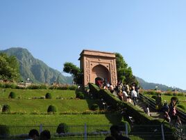 The Mughals annexed Kashmir in 1586 after a period of internal instability in the valley, and added it to their Kabul province. Mughal emperor Akbar visited the valley three times. During his second visit in 1592, an elaborate Diwali celebration was held in Srinagar.[44] On the final such visit, he was accompanied by the first recorded European visitors to the area.[lower-alpha 4] Akbar built fortifications around the Hari Parbat hill, and established a township called Nagar Nagar there.[45] He also built a shrine for Hamza Makhdoom, a Sufi mystic of Kashmir's Rishi order, on the southern slope of Hari Parbat which was later expanded several times.[46] His successor Jahangir was particularly fond of the Kashmir valley and frequently visited it.[45] His rule brought prosperity to Srinagar, and several Mughal gardens were built in the city and around the Dal lake during his and his successor Shah Jahan's reign, including the Shalimar and Nishat Bagh. Empress Nur Jahan built the Pathar Mosque on the left bank of Jhelum river opposite the Khānqāh-e-Moula in 1623, the mosque was however deemed unfit for worship soon after its construction and used instead for non-religious purposes.[47] Shah Jahan made Kashmir into a separate Subah (province) with its administrative seat at Srinagar in 1638. The Aali Masjid was built during the reign of Aurangzeb (1658–1707), as was the Safa kadal bridge over the Jhelum. The moi muqaddas, a relic believed to be the hair strand of prohphet Muhammad’s beard, also arrived in Kashmir during this time, and was housed in a Mughal palace at Hazratbal, which became the Hazratbal Dargah. A number of Europeans visited the city during the later Mughal period.[lower-alpha 5]