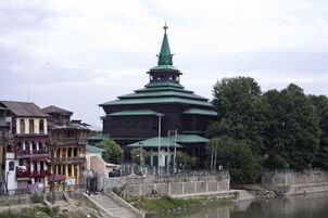 Rinchana, a Buddhist convert to Islam who briefly ruled Kashmir in the early 14th century, built the first mosque in Kashmir on the site of a Buddhist temple in a colony of Srinagar built by him.[37] The Muslim rulers that came after him established their capitals in areas of present-day old city Srinagar.[38] During the rule of the Sultans, the city became synonymous with the Kashmir valley, and 'Srinagar' fell into disuse as a name for it.[lower-alpha 3][36] During the rule of Qutbuddin, Islamic preacher Mir Sayyid Ali Hamadani visited the valley and established his seat of preaching in Srinagar. Sultan Sikandar Shahmiri (1389–1413 CE) built the Khanqah-e-Moula at this location, and also built the Jamia Mosque at Nowhatta in 1402.[39] The oldest surviving example of forcible conversion of a Hindu place of worship into Muslim shrine in Kashmir also appears from Srinagar under Sikandar’s rule.[40] Sikandar’s successor Zain-ul-Abidin undertook several constructions in and around Srinagar. He built the Zainakadal bridge connecting the two halves of the city on either side of the Jhelum river, the Mar canal and two islands inside Dal lake called Sona Lank and Rupa Lank.[41] He also built a stone shrine for his Islamic teacher at Madin Sahib, and a brick mausoleum for his mother constructed using materials from a Hindu structure and showing Timurid influences,[42] where he was also buried after his death. He is also credited with establishing industries around the arts of shawl and carpet weaving, papier-maché, and wood carving in Srinagar.[43]
