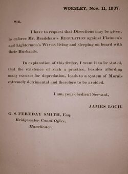 Loch was extremely busy and did not have time to deal with the detailed administration of the Trust. He therefore looked for a deputy to take on these duties. His first choice was Richard Smith who was the mine agent to the Trustees of the 1st Earl of Dudley. However this was perceived as poaching and it led to such controversy that Smith declined the offer and recommended his son, George Samuel Fereday Smith for the post. Fereday Smith was appointed as Deputy Superintendent in March 1837 on a salary of £600 a year, half of the salary which had been offered to his father.[74] Loch immediately undertook a reorganisation of the administration and efficiency of the business,[75] restored the agreement with the Old Quay Company to raise freight charges, and improved the facilities for passengers, including the introduction of "swift boats".[76] By 1837, the trustees employed around 3,000 people (including those working in the colliery and in Worsley Yard), making it one of the largest employers in the country at the time.[77] Since the death of the Duke the amount of freight carried by the canal had almost trebled; in 1803 it carried 334,495 long tons (339,863 t) of goods and in 1836 968,795 long tons (984,341 t).[78]