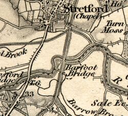 In September 1761, with his assistant Hugh Oldham,[21] Brindley surveyed an extension from Longford Bridge to Hempstones, near Halton, Cheshire.[11] He assisted in obtaining parliamentary approval for the Bridgewater Canal Extension Act 1762[22] (2 Geo. 3. c. 11 Pr.) which allowed the construction of an extension to the canal, from Manchester, to the River Mersey at Runcorn.[23] Despite objections from the Mersey and Irwell Navigation Company,[11] Royal assent was given on 24 March 1762.[24] A junction, Waters Meeting, was created in Trafford Park, at which the new extension branched south through Stretford, Sale, Altrincham, Lymm and finally to Runcorn.