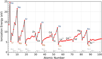 Ionization energy trends plotted against the atomic number, in units eV. The ionization energy gradually increases from the alkali metals to the noble gases. The maximum ionization energy also decreases from the first to the last row in a given column, due to the increasing distance of the valence electron shell from the nucleus. Predicted values are used for elements beyond 104.