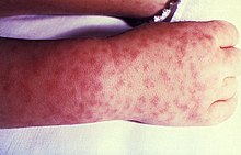 The classic Rocky Mountain Spotted Fever rash occurs in about 90% of patients and develops 2 to 5 days after the onset of fever. The characteristic rash appear as small, flat, pink macules that develop peripherally on the patient's body, such as the wrists, forearms, ankles, and feet. During the course of the disease, the rash will take on a more darkened red to purple spotted appearance and become more evenly distributed.[citation needed]