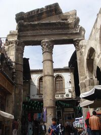 Damascus was entirely redesigned by the Romans after Pompey conquered the region. The Old Town of Damascus retains the rectangular shape of the Roman city, with its two main axes: the Decumanus Maximus (east-west; known today as the Via Recta) and the Cardo (north-south), the Decumanus being about twice as long. The Romans built a monumental gate at the eastern end of Decumanus Maximus. The gate originally had three arches, with the central arch for chariots and others for pedestrians.[24]