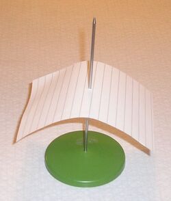 A spindle (or colloquially, a spike) is an upright spike used to temporarily hold papers. "Spindling" or "spiking" is the act of spearing an item onto the spike. A spindle was often used in restaurants to hold orders from the waitstaff to the kitchen.[1]