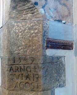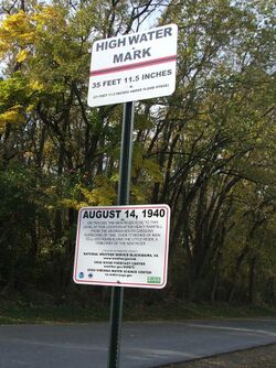 A high water mark is a point that represents the maximum rise of a body of water over land. Such a mark is often the result of a flood, but high water marks may reflect an all-time high, an annual high (highest level to which water rose that year) or the high point for some other division of time. Knowledge of the high water mark for an area is useful in managing the development of that area, particularly in making preparations for flood surges.[1] High water marks from floods have been measured for planning purposes since at least as far back as the civilizations of ancient Egypt.[2] It is a common practice to create a physical marker indicating one or more of the highest water marks for an area, usually with a line at the level to which the water rose, and a notation of the date on which this high water mark was set. This may be a free-standing flood level sign or other marker, or it may be affixed to a building or other structure that was standing at the time of the flood that set the mark.[3]