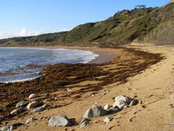 A high water mark is not necessarily an actual physical mark,[4] but it is possible for water rising to a high point to leave a lasting physical impression such as floodwater staining. A landscape marking left by the high water mark of ordinary tidal action may be called a strandline and is typically composed of debris left by high tide. The area at the top of a beach where debris is deposited is an example of this phenomenon. Where there are tides, this line is formed by the highest position of the tide, and moves up and down the beach on a fortnightly cycle.[5] The debris is chiefly composed of rotting seaweed, but can also include a large amount of litter, either from ships at sea or from sewage outflows.[6]