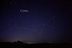 Cetus may have originally been associated with a whale, which would have had mythic status amongst Mesopotamian cultures. It is often now called the Whale, though it is most strongly associated with Cetus the sea-monster, who was slain by Perseus as he saved the princess Andromeda from Poseidon's wrath. It is in the middle of "The Sea" recognised by mythologists, a set of water-associated constellations, its other members being Eridanus, Pisces, Piscis Austrinus and Aquarius.[9]