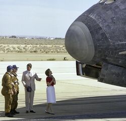 "President Ronald Reagan chats with NASA astronauts Henry Hartsfield and Ken Mattingly on the runway as first lady Nancy Reagan inspects the nose of Space Shuttle Columbia following its Independence Day landing at Edwards Air Force Base on July 4, 1982."[9] |