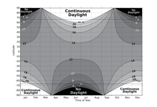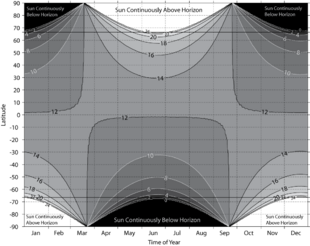 In addition the length of each day, which is determined by the season, has a significant impact on the climate. The 24-hour days found near the poles in summer result in a large daily-average solar flux reaching the top of the atmosphere in these regions. On the June solstice 36% more solar radiation reaches the top of the atmosphere over the course of the day at the North Pole than at the Equator.[2] However, in the six months from the September equinox to March equinox the North Pole receives no sunlight.