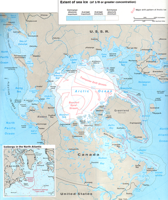 The map at right shows the areas covered by sea ice when it is at its maximum extent (March) and its minimum extent (September). This map was made in the 1970s, and the extent of sea ice has decreased since then (see below), but this still gives a reasonable overview. At its maximum extent, in March, sea ice covers about 15 million km2 (5.8 million sq mi) of the Northern Hemisphere, nearly as much area as the largest country, Russia .[9]
