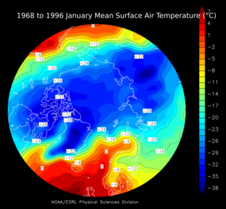 The maps on the right show the average temperature over the Arctic in January and July, generally the coldest and warmest months. These maps were made with data from the NCEP/NCAR Reanalysis, which incorporates available data into a computer model to create a consistent global data set. Neither the models nor the data are perfect, so these maps may differ from other estimates of surface temperatures; in particular, most Arctic climatologies show temperatures over the central Arctic Ocean in July averaging just below freezing, a few degrees lower than these maps show [2][3](USSR, 1985)[citation needed]. An earlier climatology of temperatures in the Arctic, based entirely on available data, is shown in this map from the CIA Polar Regions Atlas.[3]