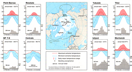 In the figure above showing station climatologies, the lower-left plot, for NP 7–8, is representative of conditions over the Arctic Basin. This plot shows data from the Soviet North Pole drifting stations, numbers 7 and 8. It shows the average temperature in the coldest months is in the −30s, and the temperature rises rapidly from April to May; July is the warmest month, and the narrowing of the maximum and minimum temperature lines shows the temperature does not vary far from freezing in the middle of summer; from August through December the temperature drops steadily. The small daily temperature range (the length of the vertical bars) results from the fact that the sun's elevation above the horizon does not change much or at all in this region during one day.