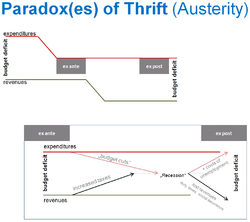 Many scholars have argued that how the debate surrounding austerity is framed has a heavy impact on the view of austerity in the public eye, and how the public understands macroeconomics as a whole. Wren-Lewis, for example, coined the term 'mediamacro', which refers to "the role of the media reproducing particularly corrosive forms of economic illiteracy—of which the idea that deficits are ipso facto 'bad' is a strong example."[32] This can go as far as ignoring economists altogether; however, it often manifests itself as a drive in which a minority of economists whose ideas about austerity have been thoroughly debunked being pushed to the front to justify public policy, such as in the case of Alberto Alesina (2009), whose pro-austerity works were "thoroughly debunked by the likes of the economists, the IMF, and the Centre for Budget and Policy Priorities (CBPP)."[33] Other anti-austerity economists, such as Seymour[34] have argued that the debate must be reframed as a social and class movement, and its impact judged accordingly, since statecraft is viewed as the main goal.