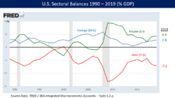 By definition, a government budget deficit must exist so all three net to zero: for example, the U.S. government budget deficit in 2011 was approximately 10% of GDP (8.6% of GDP of which was federal), offsetting a foreign financial surplus of 4% of GDP and a private-sector surplus of 6% of GDP.[28]